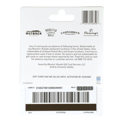 076750264597 Item Number DPCI. Free and open company data on Florida US company BLOOMIN BRANDS GIFT CARD SERVICES LLC company number L07000107628. The current status of the business is Active.
